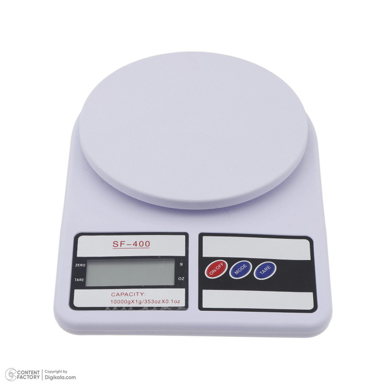 ترازو دیجیتال آشپزخانه مدل SF-400 با دقت اندازهگیری 1 گرم و ظرفیت 10 کیلوگرم، مناسب برای آشپزی، قنادی و مصارف خانگی. دارای نمایشگر LCD، قابلیت صفر کردن (Tare) و خاموشی خودکار.