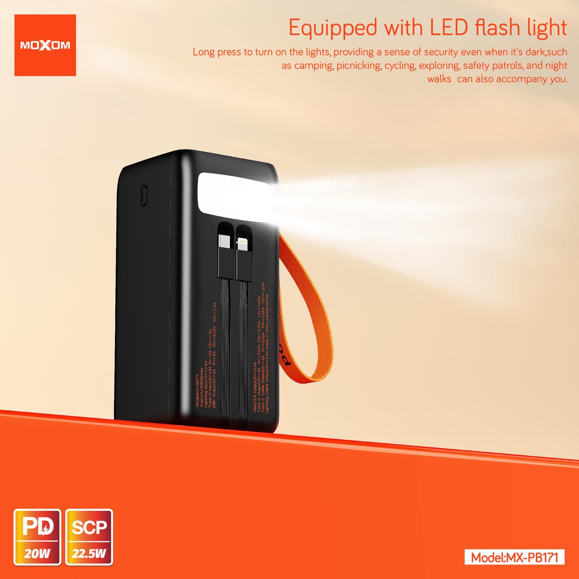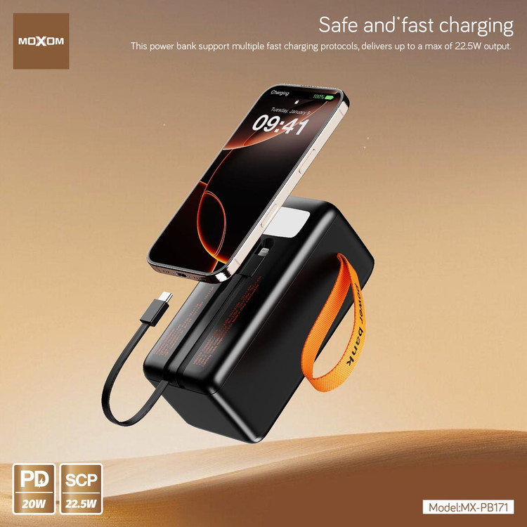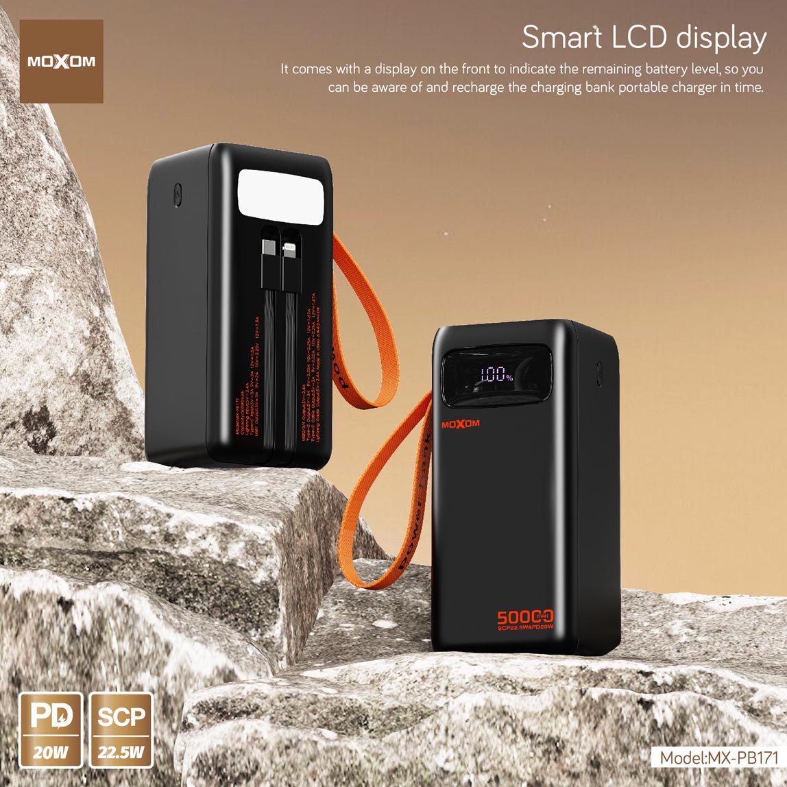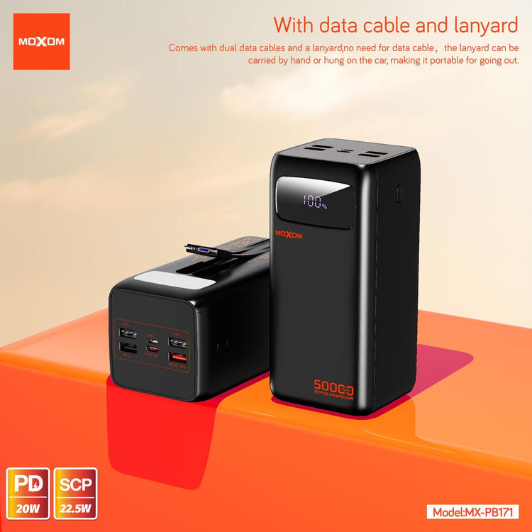 پاور بانک 50000 میلیآمپر MOXOM مدل MX-PB171 با پشتیبانی از فست شارژ PD و SCP، یه انتخاب عالی برای استفاده روزمره، مسافرت، کمپ و حتی شرایط قطعی برق و خاموشی محسوب میشه.