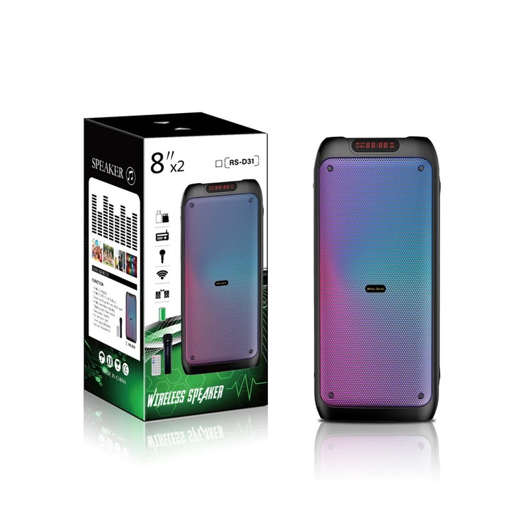 اسپیکر حرفهای PartyBox RS-D31 جدیدترین مدل از اسپیکرهای سری پارتی باکس از کمپانی معتبر تلاش می باشد. شما میتوانید از این سیستم صوتی در دو حالت برق یا باتری استفاده کنید. درایورهای حرفهای این اسپیکر صدای موسیقی را با وضوحبالا و بیس قدرتمندی پخش میکنند و باعث افزایش هیجان مهمانی شما میشوند. کانکشنهای پرکاربرد به شما امکان اتصال آسان به دو صورت بیسیم و باسیم را میدهند تا بتوانید با هر دستگاهی بهراحتی به این سیستم صوتی متصل شوید و موسیقی دلخواه خود را بشنوید. برای اتصال به PartyBox RS-D31 کافی است بلوتوث موبایل یا تبلت خود را روشن کنید، اسپیکر را جستجو کرده و متصل شوید. میتوانید آهنگهای موردعلاقه خود را در یک فلش مموری بریزید و از طریق پورت USB به اسپیکر متصل کرده و پخشکنید. همچنین میتوانید توسط کابل AUX دستگاه خود را از طریق ورودی 3.5 میلیمتری به اسپیکر متصل کنید. حالا فقط دکمه پخش را فشار داده و از شنیدن موسیقی موردعلاقه خود لذت ببرید. همچین میکروفون های بیسیم و دیجیتال همراه با اسپیکر علاوه بر کیفیت بسیار بالا شامل 4 صدای مختلف میباشد که بازی خانندگی را بسیار جذاب و سرگرم کننده میکند.