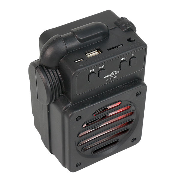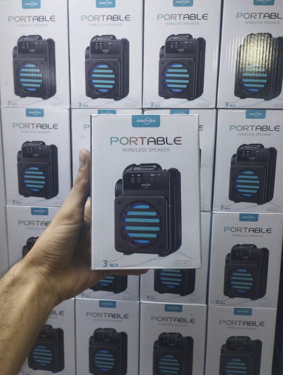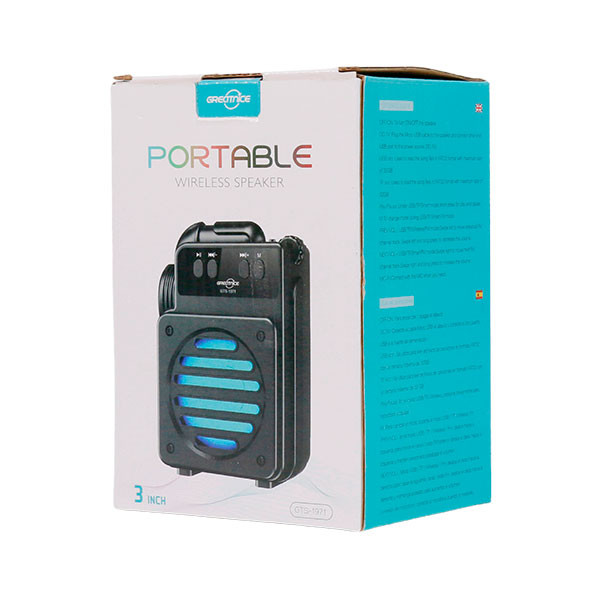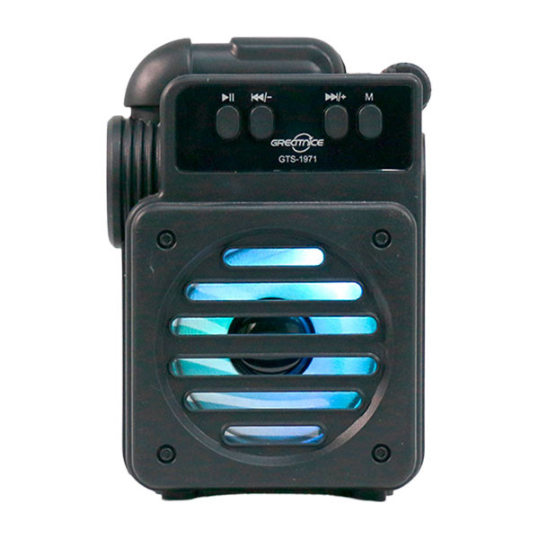 اسپیکر بی سیم قابل حمل گریت نایس مدل GTS1971 این اسپیکر امکان دریافت امواج رادیو FM برای دوستداران برنامه های رادیویی را دارد و موفق به کسب استاندارد سلامت و ایمنی محصول شامل CE / RoHS و FCC شده است . برخورداری از کلید های فیزیکی تعبیه شده بر روی بدنه به منظور مدیریت فایل در حال پخش، ولوم، Mood و … کار با این اسپیکر را بسیار راحت کرده است. تامین انرژی از طریق باتری داخلی قابل شارژ توسط درگاه میکرو یو اس بی تعبیه شده بر روی بدنه و کابل همراه که داخل کارتن اسپیکر موجود است .این اسپیکر مجهز به درایو 3 اینچی با امکان پخش صدا با کیفیت HD، بهره مندی از نورپردازی داخلی RGB جهت ایجاد جلوه بصری زیبا است و متریال ساخت بدنه پلاستیک با کیفیت مقاوم در برابر فشار و ضربه، تعبیه دسته در قسمت پشتی محصول به منظور سهولت در حمل و نقل و در نهایت اتصال بی سیم توسط رابط بلوتوث، پشتیبانی از فلش مموری USB و حافظه رم میکرو SD تا حداکثر ظرفیت 32 گیگابایت به منظور پخش فایل های ذخیره شده از قابلیت های اسپیکر بلوتوثی رم و فلش خور Greatnice GTS-1971 است .